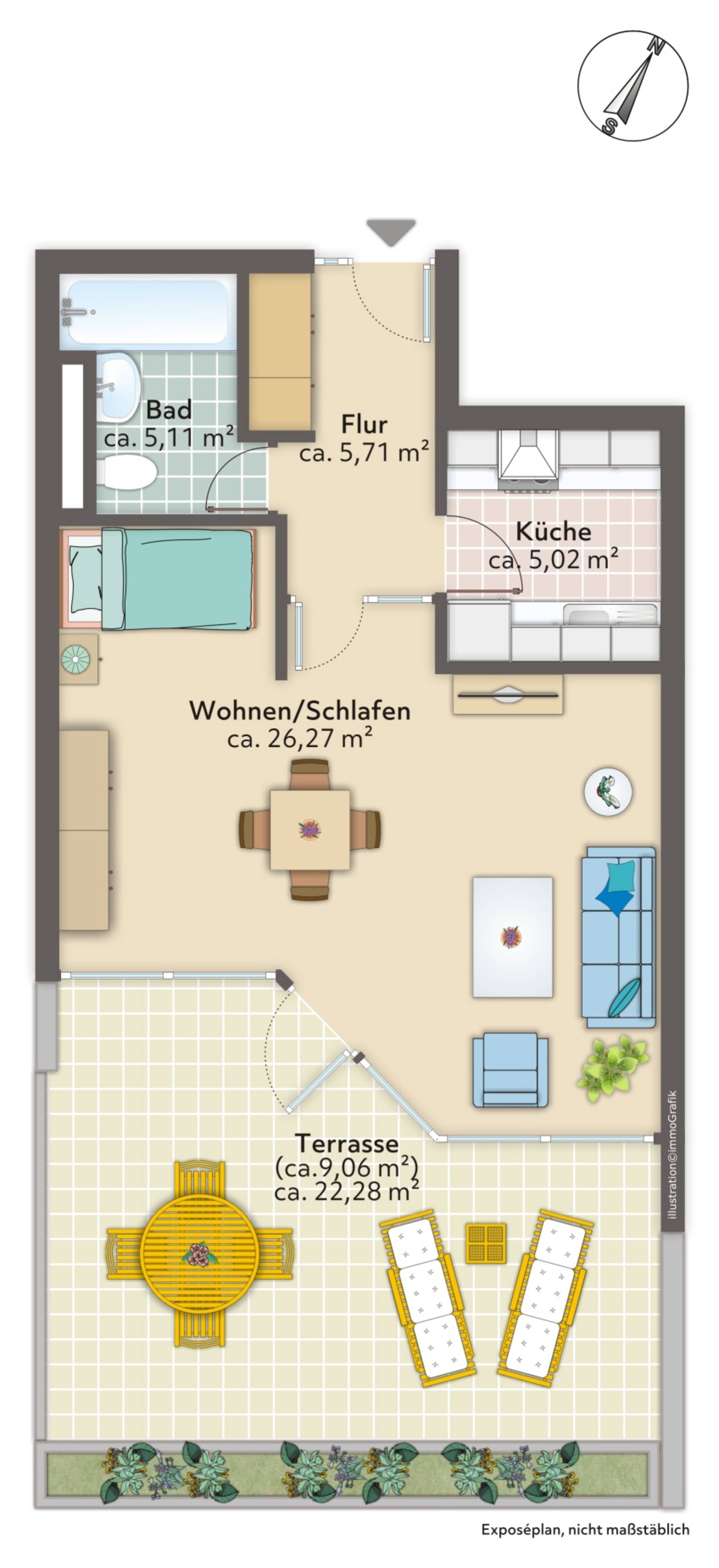 ⇒ Appartement mit eineinhalb Zimmern und ca. 51 m² Wohnfläche