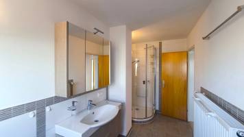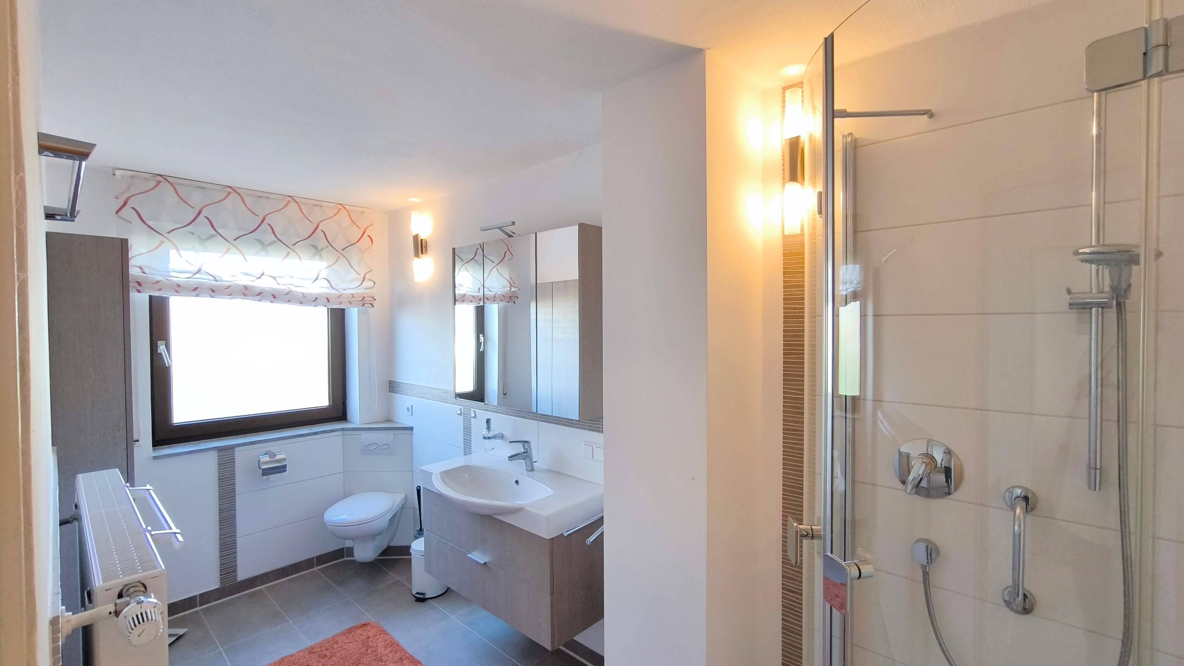 - Neugestaltetes Tageslicht-Badezimmer mit Dusche, Waschbecken und WC