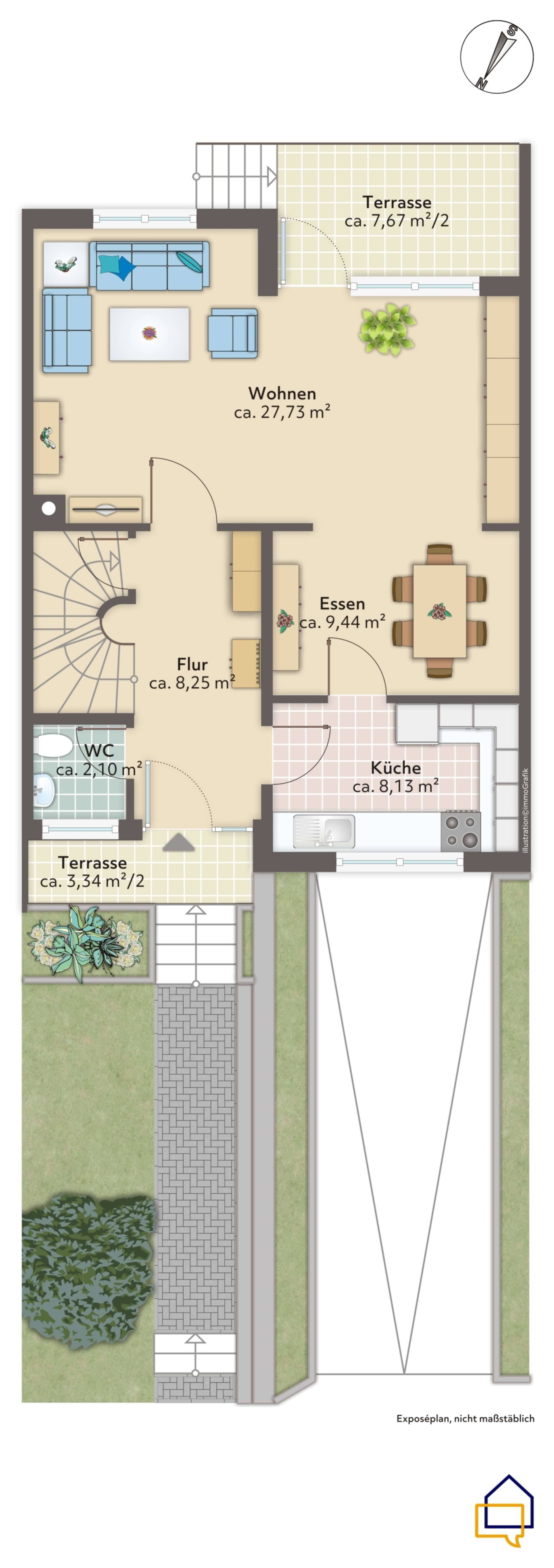 - Außenbereich: Eigener Garten mit Terrasse und praktischem Kellerzugang