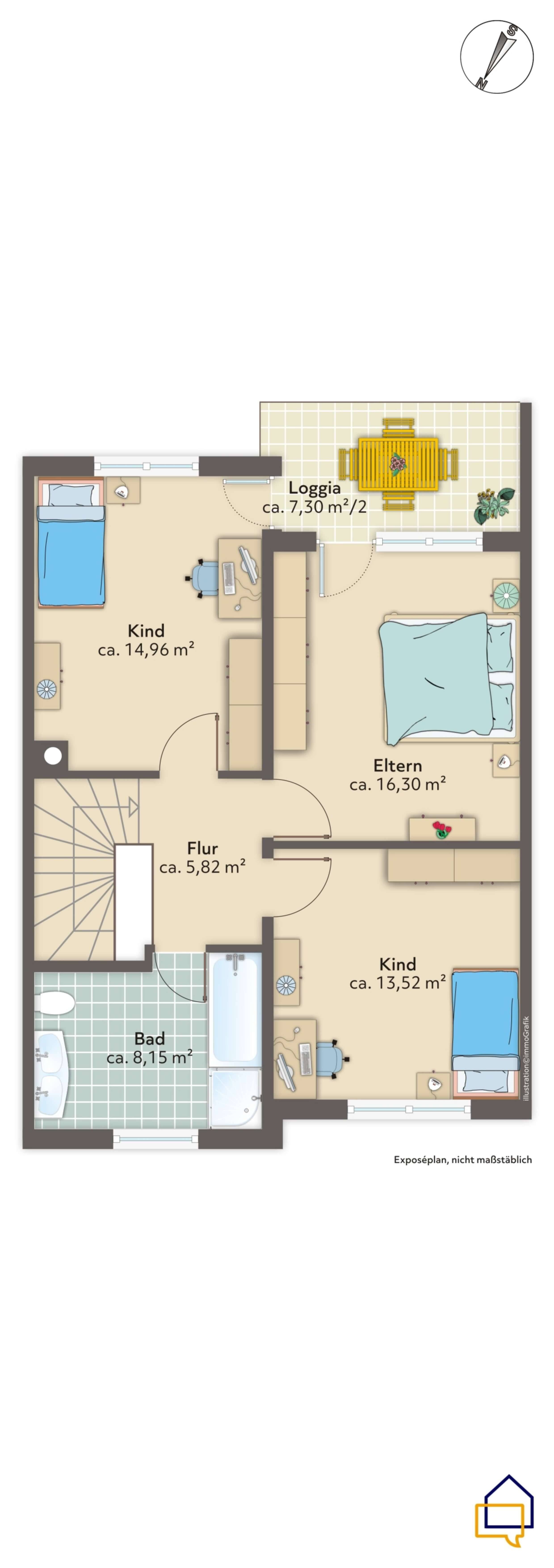 - Obergeschoss: Die obere Etage ist ideal für zwei Personen konzipiert. Neben dem Schlafzimmer und einem modernen Tageslichtbad mit Dusche bietet ein drittes Zimmer perfekte Möglichkeiten als Home-Office oder Gästezimmer. Ein separates Ankleidezimmer sorgt für zusätzlichen Komfort und Ordnung.